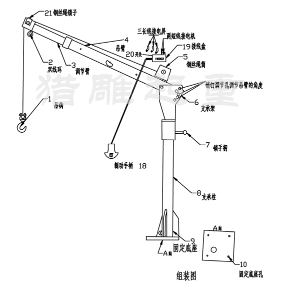 1、 選擇車載小吊機合適的安裝位置,將底座(9)固定好;